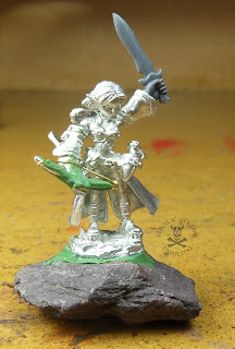 The small scale of the model meant that I felt that the base needed some presence to stand out amongst other miniatures. Fortunately - living in Wales - slate is everywhere, I grabbed a couple of chunks from the front garden and figured out which worked best for the size of the tag and pose. A blob of green stuff stuck her to her imposing rock and we were starting to get somewhere!