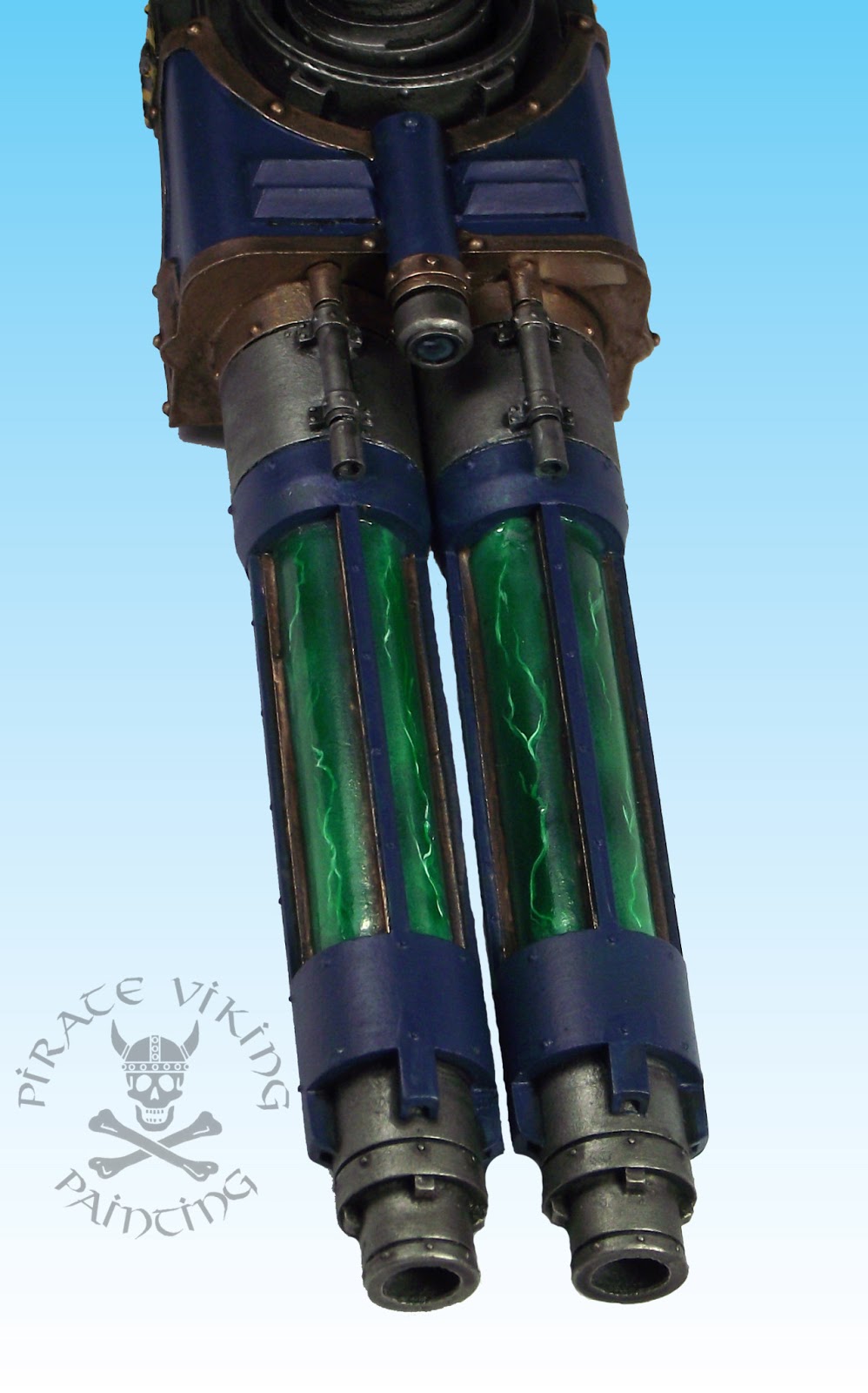 While we are talking about this I should mention the green! While musing on the colour scheme for this weapon I had done my usual internet meanderings and had found this on Spikey Bits. I liked the idea of not having just plain steel tubes running through the middle but thought that the linked example was a little too cartoony for me and didn't serve to explain how the weapon worked. It was just lightning for lightning's sake. For Pyladii Alpha I figured that making the tubes look like they contained some sort of highly charged plasma cloud, I picture it flashing into light when the weapon fires. Yeah, I know the physics doesn't exactly stack up but there you go! To achieve this I first airbrushed a series of different diffuse clouds in white over the black undercoat to achieve a greyscale cloudy effect. Then I painted white lighting on it fading out at either end to indicate that it was simply passing out of sight rather than petering out. Then I airbrushed green ink over the result and left it to dry. Inks are perfectly translucent and thus simply tint the greyscale below and are therefore perfect for this role. I repainted the brightest areas of the lightning in white and resprayed with green ink. A thin coat of water effects finished the deal. More titan stuff after the weekend folks!
